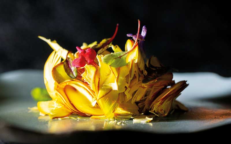 Slice with a mandoline. On the plate, place the flowers and dress them with garlic oil, chive oil, smoked oil, salt, black pepper, and chopped chives. We make this operation 3 times, overlapping the Caesar's mushroom slices to form a flower shape.