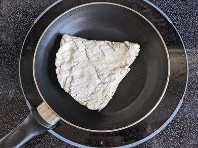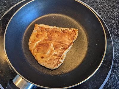 If I were doing a whole pizza this way, I’d remove it from the pan at this stage, put it on a baking tray and add pizza sauce, cheese and any other toppings I wanted. I’d then put it on the oven at 400 degrees for a few minutes.